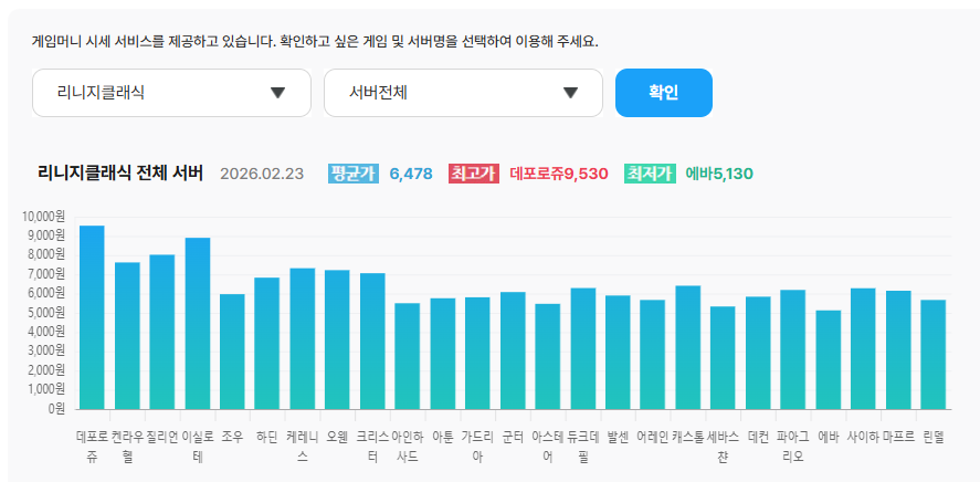 | 서버명 | 1만 아데나당 평균 시세 (02/23) | 전일 대비 등락 |