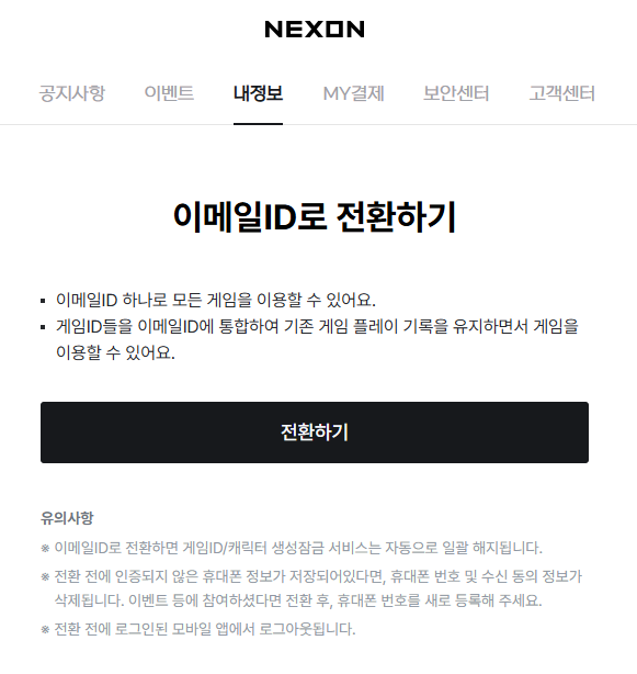 - 넥슨 ID 형태: 현재 사용하는 넥슨 ID가 이메일 형태(jason@naver.com)가 아닌, 과거에 생성된 영문+숫자 조합의 구 아이디(jason123)여야 합니다. (이미 이메일 아이디로 전환했다면 불가능합니다.)